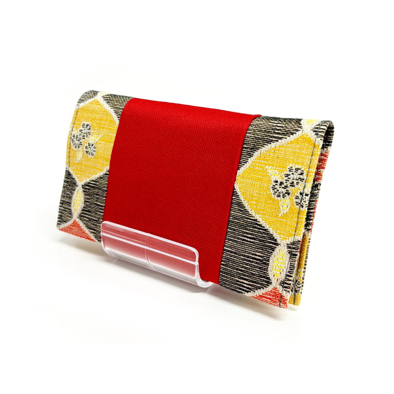鮮やかな色彩と華やかで高級感あるデザインが織りなす名刺ケースです。ウールの着物生地に帯地を掛け合わせたデザインとなってます。開くと両側に2つのポケットがあり、片側に訳15枚づつ名刺を分けて収納できます。名刺と一緒にICカードを入れても便利です。